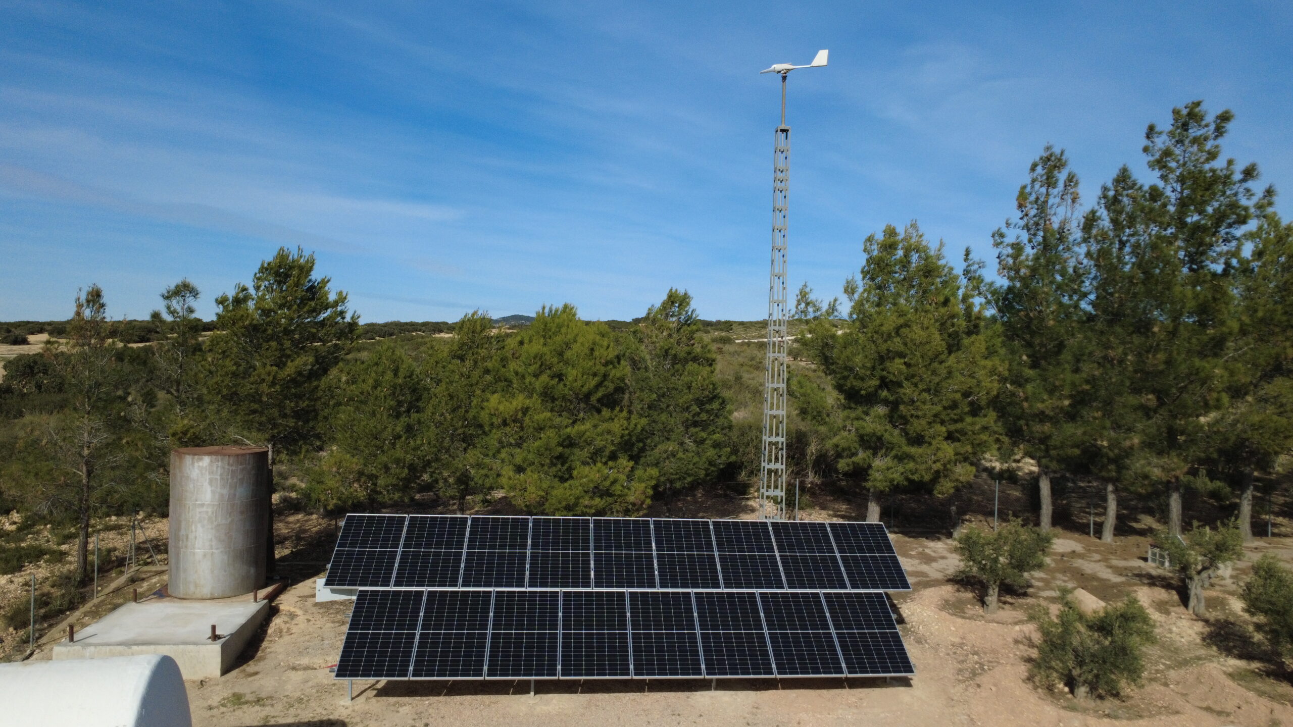 En este proyecto concreto, hemos llevado a cabo la construcción, adecuación y puesta en funcionamiento de un pozo de agua destinado al suministro completo de una finca familiar. Para ello, hemos instalado un sistema híbrido de energía solar y eólica que alimenta eléctricamente la bomba de extracción, asegurando un funcionamiento estable y continuo a lo largo de todo el año. La energía generada por los paneles solares y el aerogenerador se transforma en electricidad y se adapta a las necesidades de la bomba, permitiendo la extracción de agua de manera autónoma, eficiente y respetuosa con el medio ambiente.